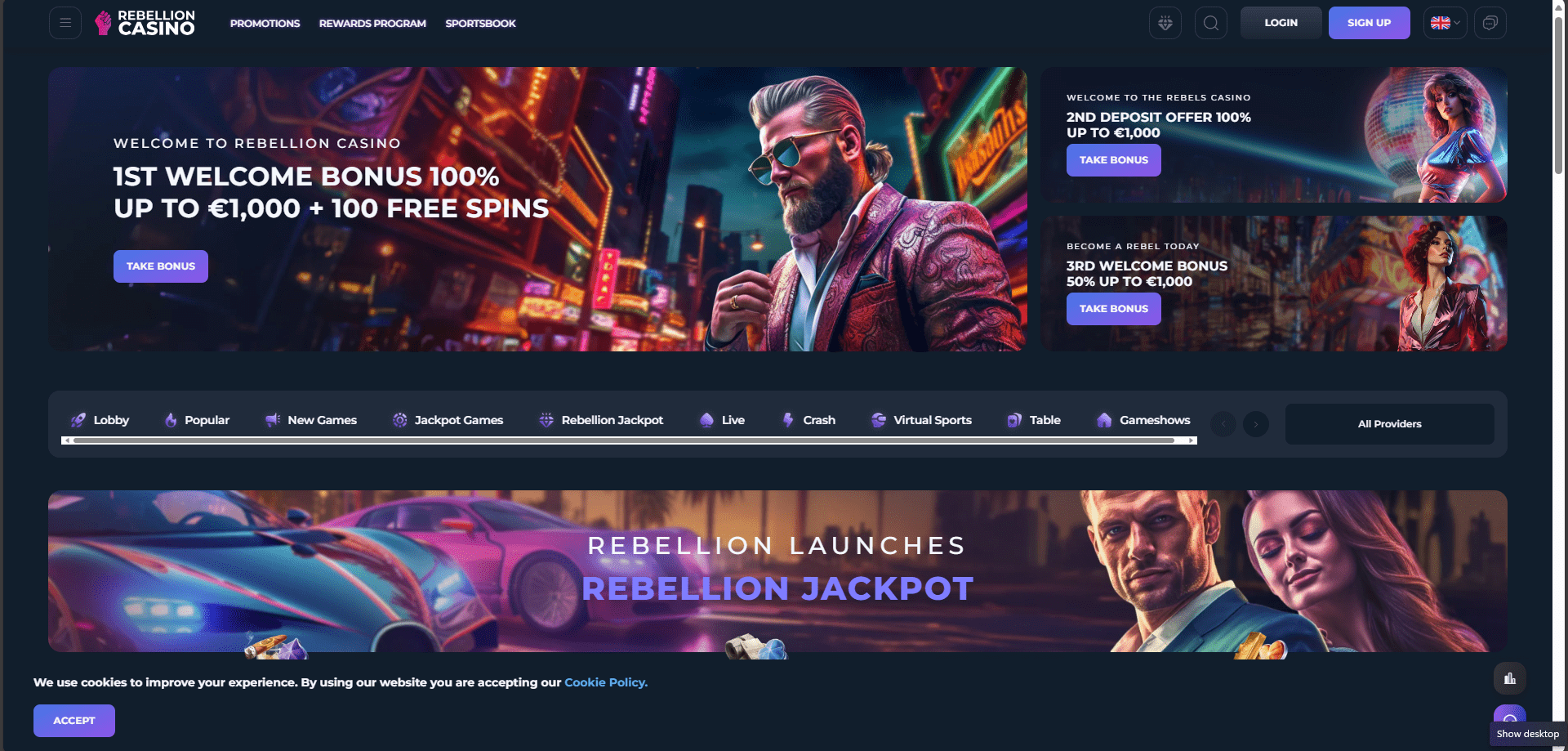 The well-known gaming company Dama NV is launching Rebellion Casino, its newest endeavor. The operator has over 80 brands in its vast portfolio, the majority of which we have already evaluated, and specializes in creating websites that are friendly to cryptocurrencies. All of the company's unique characteristics, including an abundance of thrilling promos, a variety of payment methods for simple deposits and payments, and a sizable game library powered by some of the most well-known providers in the online gaming industry, are owned by the newest member of its family. Additionally, Rebellion Casino has a sportsbook where you may wager on storied football, tennis, basketball, and other sports tournaments.
